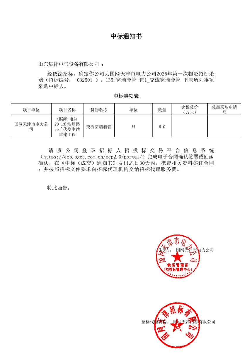 交流穿墻套管中標通知書